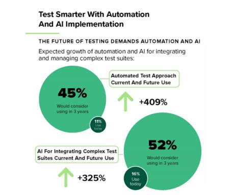 然而,企業也認識到,手動和部分自動化的測試方法無法應對日益提升的產品復雜度。因此,45%的受訪者考慮會在未來三年內采用全自動方法,增幅為409%。超過一半(52%)的受訪者表示,他們會考慮使用人工智能來整合復雜的測試套件,增幅為325%。