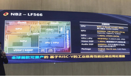 作為第一款可量產的基于RISC-V的高端12nm的工業級SOC級別芯片處理器,NB2 LF566包含4核1.8G的CPU,算力超過32000DMIPS,GPU850MHZ,NPU1.4GHZ,VPU是4K 60fps,其主要面向邊緣計算、深度學習、機器視覺及語音處理等多類應用。