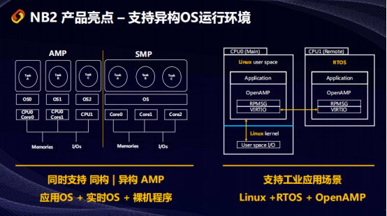 眾所周知,在工業應用場景中,除了一般的程序,還有一些要求非常高,例如部分程序需要運行在裸機之上,有一部分希望運行在Linux。NB2的實現方式是在應用層下,Linux-RTOS+OpenAMP。如果不能支持AMP,就無法在每個核上分別預警不同的操作系統,這也是躍昉在工業場景上所做的特殊處理。