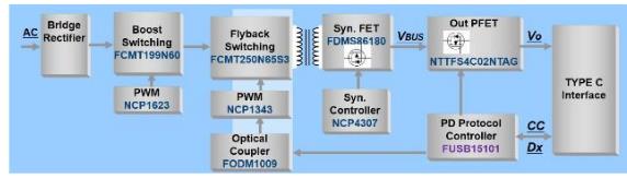 由于電源輸出功率在75W以上,就需要在電路設(shè)計(jì)中增加PFC電路來(lái)達(dá)到高功率因數(shù)下的行業(yè)標(biāo)準(zhǔn)。因此,本方案除了采用onsemi旗下新一代QR Flyback控制器NCP1343外,還在電路前級(jí)使用onsemi NCP1623作為PFC級(jí)的控制,提高了設(shè)計(jì)需求。并在輸出控制級(jí)增加onsemi FUSE15101的設(shè)計(jì)滿足了PD3.0/PPS協(xié)議標(biāo)準(zhǔn)。