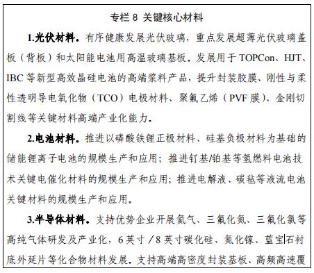 面向光伏、儲能電池、硅能源信息技術產品先進工藝和關鍵特色工藝,聚焦光伏玻璃、高端漿料、封裝膠膜、鋰電池正極材料和硅基負極材料、化合物半導體等關鍵材料,支持產業鏈上中下游聯合攻關,加強基礎技術研究和產業化,支持省內重點材料企業做大做強,積極引進國內外先進材料企業,健全產業鏈配套體系和能力,培育和創建一批綠色工廠,打造一批具有核心競爭力和特色優勢的新材料產品和專精特新企業。