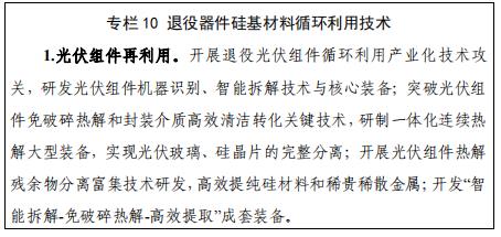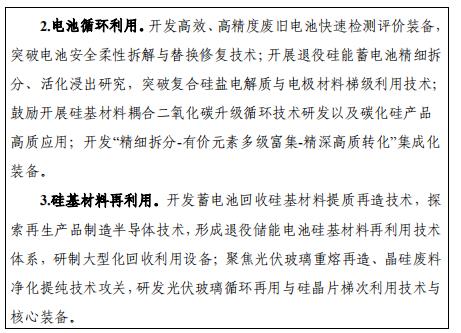 加快開展退役器件硅基材料清潔回收及高質再造技術研發和產業化,加強退役光伏組件、儲能電池循環利用技術攻關,加大對專用部件、關鍵裝備、生產線、智能控制系統等研發應用的支持力度,研究全鏈條智慧監測與綠色低碳調控技術,支撐監測分析數據平臺建設。支持開展十萬噸級退役光伏組件高效回收和硅基材料循環利用、萬噸級廢舊電池精細回收等工程示范。
