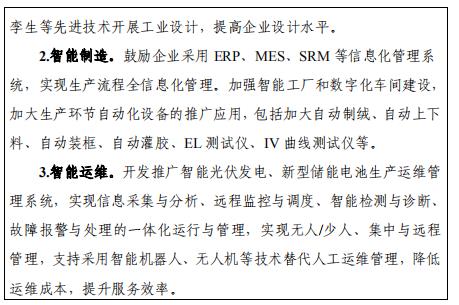 推動互聯網、大數據、人工智能、5G等信息技術與硅能源產業深度融合。加快智能工廠和數字化車間建設,推進關鍵工序數字化改造,優化生產工藝及質量管控系統,提高產品制造全周期信息化管理水平。推動基礎材料生產智能升級,提升硅片、儲能電池材料和高性能電池等生產、包裝、儲存、運輸的機械化與自動化水平,提高產品一致性和穩定性,提升智能制造水平。培育硅能源領域特色工業互聯網平臺,支持制造業延伸服務鏈條,發展服務型制造新模式,推動提升智能設計、智能集成、智能運維水平。發展智慧能源系統關鍵技術和電網智能調度運行控制與維護技術。