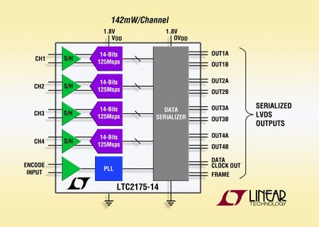 低功率:在 125Msps 時消耗 558mW (每通道 140mW) (LTC2175)