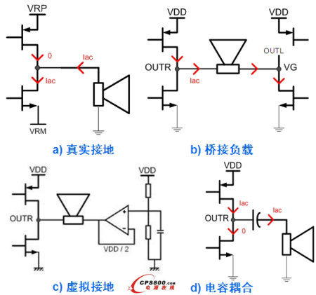 圖1:不同立體聲音頻放大器輸出段設計電路圖