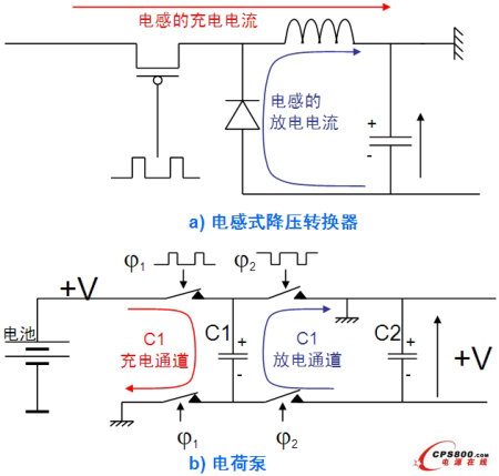 可以考慮兩種方案來產生負電壓。一是利用電感式降壓轉換器,二是利用電荷泵。電感式降壓轉換器采用電感作為儲能及傳遞能量的介質(見圖2a)。這種方案中,MOSFET導通時,電感充電,充電電流方向如紅色線條所示,此時肖特基二極管截止;MOSFET關閉時,肖特基二極管導通,電感放電,放電電流方向如藍色線條所示,同時給電容充電。由于電容正極接地,故給電容的充的電壓為負電壓,即輸出為負電壓。這種產生負電壓的方案效率極高,且能提供大電流,但其問題在于所采用的電感跟在輸出段移除的電容尺寸一樣大、價格一樣貴,即不能體現出減小電路板占用空間和降低成本的優勢。