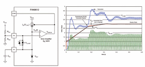 任何電源設(shè)計(jì)都要優(yōu)先考慮啟動(dòng),PFC轉(zhuǎn)換器也不例外。對大多數(shù)PFC應(yīng)用而言,穩(wěn)壓輸出電壓設(shè)置點(diǎn)在400V 范圍之內(nèi),故只要有任何電壓過沖,尤其是在軟啟動(dòng)期間,就會(huì)對輸出大電容和開關(guān)組件造成額外的應(yīng)力。FAN9612能夠解決與啟動(dòng)有關(guān)的兩大重要問題。第一是能夠在整個(gè)啟動(dòng)程序期間保持閉環(huán)軟啟動(dòng)。圖1所示為FAN9612專有軟啟動(dòng)電路的功能實(shí)現(xiàn)及啟動(dòng)程序仿真。