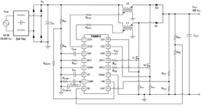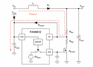 除了閉環(huán)軟啟動(dòng)工作模式之外,F(xiàn)AN9612還具有通過VOUT電阻分壓器網(wǎng)絡(luò)直接啟動(dòng)的可選功能。對于沒有足夠的輔助偏置電源電壓或待機(jī)電源的應(yīng)用,啟動(dòng)任何高電壓IC都必須對VDD電容進(jìn)行充電,直到電壓達(dá)到控制IC欠壓鎖定(UVLO)導(dǎo)通閾值為止。這一般需要額外的電路,因而會(huì)增加功耗及降低效率。有些設(shè)計(jì)人員會(huì)采用這種方法:當(dāng)通過自舉偏置(bootstrap bia)電源對PFC控制IC進(jìn)行供電時(shí),關(guān)斷啟動(dòng)電路。雖然這種方案有助于降低功耗,但往往需要高側(cè)開關(guān)和驅(qū)動(dòng)電路,從而增加外部組件的數(shù)目。FAN9612經(jīng)特別設(shè)計(jì),無須外部啟動(dòng)電阻即可啟動(dòng)。在FB和VDD之間增加一個(gè)小信號(hào)二極管DSTART即可提供一條經(jīng)過RFB1的電流路徑,見圖2中的紅色虛線。一旦內(nèi)部5V參考電壓有輸出,小信號(hào)MOSFET QSTART就被開通,電阻反饋網(wǎng)絡(luò)即從啟動(dòng)功能中解脫出來。另外也可以根據(jù)情況,忽略DSTART和QSTART,采用傳統(tǒng)的啟動(dòng)方法。