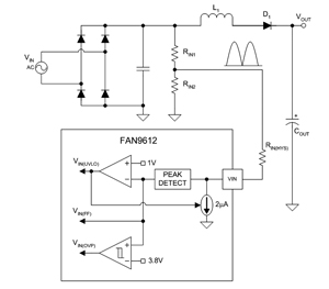 FAN9612采用數(shù)項(xiàng)節(jié)能技術(shù)來滿足額定負(fù)載和輕負(fù)載下的效率要求。其同步電路的一部分利用最大頻率鉗位來限制輕載下和AC輸入電壓的過零點(diǎn)附近的與頻率相關(guān)的Coss MOSFET開關(guān)損耗。在VIN線電壓部分大于VOUT/2期間,使用谷底開關(guān)技術(shù)以感測最佳MOSFET導(dǎo)通時(shí)間,可進(jìn)一步降低Coss電容性開關(guān)損耗。另一方面,當(dāng)VIN小于VOUT/2時(shí),主功率MOSFET利用零電壓開關(guān)(ZVS)導(dǎo)通。ZVS結(jié)合BCM工作模式的零電流開關(guān)(ZCS),可消除MOSFET導(dǎo)通開通損耗和輸出整流器的反向恢復(fù)損耗。