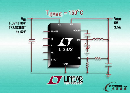 LT3972 在 3.6V 至 33V 的 VIN 范圍內工作,具過壓閉鎖保護以免受高達 62V 的瞬態影響,從而使其非常適用于汽車應用中的負載突降和冷車發動情況。其內部 4.6A 開關可以在電壓低至 0.79V 時提供高達 3.5A 的連續輸出電流。LT3972 的突發模式工作提供超低靜態電流,非常適用于諸如汽車或電信系統等應用,這類應用需要始終保持接通工作和最佳電池壽命。用戶可編程的開關頻率為 200kHz 至 2.4MHz,從而使設計師能夠優化效率,同時避開了關鍵的噪聲敏感頻段。其耐熱增強型 MSOP-10E 封裝與高開關頻率 (這允許使用小的外部電感器和電容器) 相結合,可提供一個占板面積非常緊湊和高熱效率的解決方案。