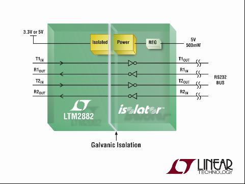 LTM2882 可滿足眾多 RS232 應用的要求,包括工業通信和測試/測量設備。在這些應用中,需要斷開接地環路或者在大共模電壓條件下工作。ESD 保護水平達 ±10kV 的收發器可在高達 1Mbps 的數據速率下運作,而且當停用時僅消耗 30μA 的停機電流。采用獨立的備用隔離數字通道能夠在不到 2μs 的時間內完成兩個驅動器的使能和停用操作,并對兩個驅動器提供了短路保護 (至 ±15V 絕對最大范圍內的任何電壓)。針對與其配對的接收器提供了共模電壓 (在 ±25V 絕對最大范圍內) 保護。LTM2882 符合歐洲標準 EN 550024 的射頻 (RF) 和磁場抗擾性測試要求。用戶將體會到自供電的 LTM2882 是如何采取諸多預防措施來保證 RS232 系統中的安全和可靠通信。