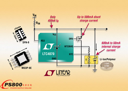 日前,凌力爾特公司 (Linear Technology Corporation) 推出面向鋰離子/聚合物電池、易于使用和纖巧的并聯(lián)電池充電器系統(tǒng) IC LTC4070。該器件以其 450nA 的工作電流,用以前不能使用的非常低電流、斷續(xù)或連續(xù)充電電源,對電池進(jìn)行充電和保護(hù)。增加一個(gè)外部 PMOS 并聯(lián)器件后,LTC4070 的充電電流可以從 50mA 提高到 500mA。一個(gè)內(nèi)部電池?zé)崃坎轵?yàn)器降低浮置電壓,以在電池溫度升高時(shí)保護(hù)鋰離子/聚合物電池。通過串聯(lián)配置幾個(gè) LTC4070,可以平衡并給多節(jié)電池組充電。LTC4070 采用扁平 (0.75mm) 8 引線 2mm x 3mm DFN 封裝,僅用需要與輸入電壓串聯(lián)的單個(gè)外部電阻器,就可以提供一個(gè)完整和超緊湊的充電器解決方案。該器件的功能非常適用于連續(xù)和斷續(xù)、低功率充電電源應(yīng)用,其中包括鋰離子/聚合物電池備份、薄膜電池、幣形電池、存儲(chǔ)器備份、具有備份的太陽能供電系統(tǒng)、嵌入式汽車系統(tǒng)以及能源提取/收集系統(tǒng)。