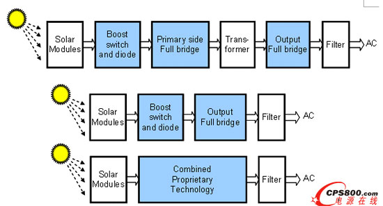光電逆變器的一般結構如圖1所示,有三種不同的逆變器可供選擇。太陽光照射在通過串聯方式連接的太陽能模塊上,每一個模塊都包含了一組串聯的太陽能電池 (Solar Cell)單元。太陽能模塊產生的直流 (DC) 電壓在幾百伏的數量級,具體數值根據模塊陣列的光照條件、電池的溫度及串聯模塊的數量而定。