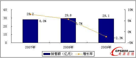 2009年中國經濟出現了完美的“V”型反轉,但中國UPS市場的復蘇之路遠沒有那么平坦。雖然在金融、通信以及交通行業中,UPS的銷售額依然保持著高速的增長,但由于制造業的低迷,整個中國UPS市場在2009年仍出現了小幅的負增長。根據ICTresearch的研究顯示,2009年全年UPS的市場銷售額達到29.13億元,比2008年略降2.3%,但全年呈現出先抑后揚的局面,市場銷售出現逐漸回暖的現象。