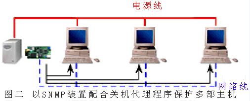 (2) 另一種方式是在UPS加裝SNMP網絡卡,而在各主機安裝關機代理程序 (圖二)。當市電中斷時SNMP網絡卡會主動送出Trap給關機代理程序,關機代理程序在收到通知后會進行倒數關機程序。采用SNMP網絡卡的好處是它不需透過計算機可直接上網,適用于UPS與主機距離較遠的情況。