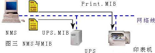 為了能有效管理網絡上眾多的設備,如服務器、集線器等通訊設備,或打印機、UPS等外圍設備,管理者會架設一部NMS(Network Management Station) 讓各裝置也就是SNMP Agent將資料響應給NMS。由于各裝置的制造廠商皆不相同,故需有一套共同的語言讓NMS與各裝置交談,這個語言也就是網絡上所謂的通訊協議,而目前應用于網管通訊協議最普遍的就是SNMP(簡單網絡管理通訊協議)。雖有了共同的語言但這些裝置仍需提供此裝置可被監控的對象描述,也就是MIB(管理信息庫)給NMS。根據MIB,NMS才能對此裝置做出正確的詢問并下達正確的命令 (圖三)。雖然RFC1628規范了一般UPS的MIB但仍不能滿足現有網絡UPS的需求,故各大UPS廠商仍然自定其私有的MIB來發揮自己UPS的特殊功能。