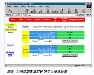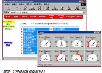 另一項網絡UPS的特殊功能則是遠程監控。由于目前網際網絡的盛行,幾乎每部計算機皆配備網絡瀏覽器,近來許多Linux業者采用網絡瀏覽器來作為系統設定與監控的接口。一些UPS大廠亦看準此一趨勢紛紛將HTTP通訊協議加入其監控軟件與SNMP卡之中 (圖四)。它的好處是在遠程無須加裝任何程序,管理者隨時隨地皆可以網絡瀏覽器得知UPS的最新狀態。