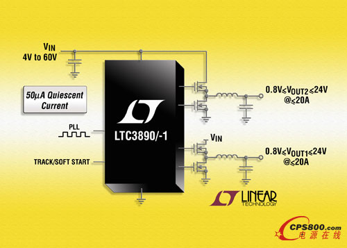 凌力爾特公司 (Linear Technology Corporation) 推出高壓雙輸出同步降壓型 DC/DC 控制器 LTC3890/-1,當一路輸出工作時,該器件僅吸取 50uA 電流,而兩路輸出都啟動時則吸取 60uA。兩路輸出停機時,LTC3890/-1 僅消耗 14uA 電流。4V 至 60V 的輸入電源電壓范圍是為保護該器件免受高壓瞬態影響、在汽車冷車發動時連續運行、以及涵蓋寬的輸入電源和電池化學組成范圍而設計的。在輸出電流高達 20A 和效率高達 95% 時,每路輸出都可以設定在 0.8V 至 24V,從而使該器件非常適用于 12V 或 24V 汽車、重型設備、工業控制、機器人和電信應用。