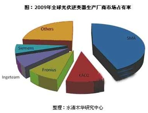 就全球來看,SMA、KACO、Fronius、Ingeteam、Siemens、Studer、Xantrex、Danfoss、Conergy、Satcon、Power-one、Outback power等基本占領全球光伏逆變器市場份額。最大前五位超過70%市場份額。2009 SMA以占據全球市場份額44%獨占鰲頭。