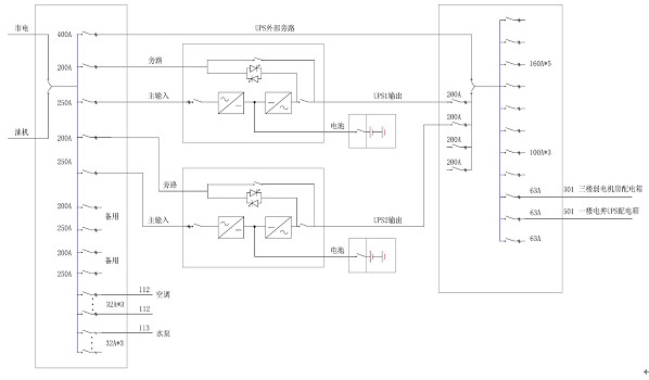 中國電信四川公司新鴻路10000號場地為四川省的核心樞紐,供電一旦出現(xiàn)異常或中斷將會帶來全省10000號系統(tǒng)的癱瘓遺以及不可估量的直接經濟損失和社會負面影響,因此對供電系統(tǒng)的可靠性要求極為嚴格,機房采用雙路高壓供電、1+1冗余UPS電源、大功率的柴油發(fā)電機提供可靠的后備供電能力,從而保障充足、持續(xù)的電力供應。本次項目UPS電源采用2臺100kVA 1+1并機冗余供電方式設計,UPS輸出分別向1F、3F、5F、8F 配套的10000號系統(tǒng)基礎設施及網絡設備負荷提供高可靠電源保障。臺達HIFT(海福)UPS電源系統(tǒng)的設計平面圖、系統(tǒng)圖 、現(xiàn)場安裝圖片分別如下。