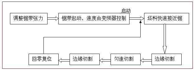 首先在工作臺上用專用夾具裝夾多晶硅坯料工件,然后調整好鋸帶張力,之后,啟動鋸帶(鋸帶的速度由變頻器控制),然后工作臺會根據設好的工藝參數進行送料,首先工作臺帶動坯料快速靠近鋸帶,然后轉為慢速進行邊緣切割,速度慢,是由于多晶硅坯料表皮較硬,速度過快容易損壞鋸帶;切完表皮后,接著轉為勻速正常切割,此過程要求送料速度極其穩定,這樣,切出來的料表面平整度才好。切到最后,又轉為邊緣切割,直到把坯料切斷,切斷后,工作臺快速返回原來的工作原點,等待操作人員將成品拿下,換上新坯料。