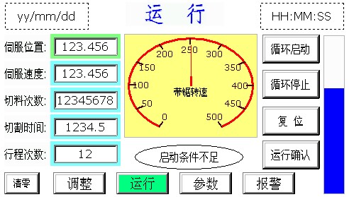 (3)客戶要求設備在參數設置后,能精確顯示此坯料的加工時間,并在工作中,實時顯示當前狀態和切割進度,還要求顯示鋸帶的實時轉速。
