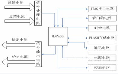 本系統采用MSP430F155型號單片機實現對開關電源的穩定控制,主要包括如下幾個部分:MSP430核心部分、反饋信號處理部分、信號輸出給定部分、控制電路部分、通訊部分及CPU外圍電路。系統總體結構如圖1所示: