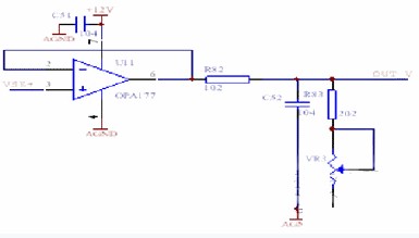 由于MSP430F155系列的單片機D/A電壓輸出的最大幅值為VCC,達不到控制電壓環和電流環所需要的幅值,從而采用圖5所示的運算放大電路,V_DW所接的是電位器,它的位置是在前面板上,通過調節電位器改變電壓參數,達到調節輸出電壓的目的。