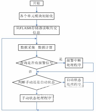 根據軟件框圖所示各部分內容,下面給出主程序的流程圖(圖7),在主程序中,主要完成初始化各個外設寄存器及變量、讀取歷史信息、實時采集數據、實時檢查報警信息并及時將各種狀態信息上傳上位機,下面主要介紹一下數據采集部分和通訊部分: