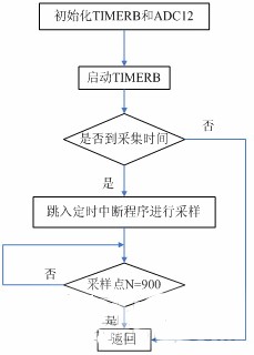 本系統高頻晶振為8MHz,用TimerB作為定時中斷器,定時器計數值為8000,即每隔1000us采一個點,每秒可采1000個數據。采集程序流程如圖8所示。
