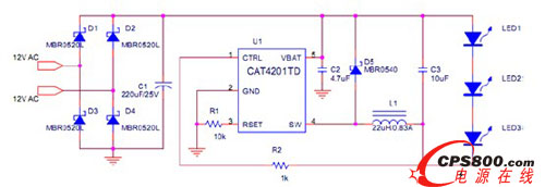 該設計中提供了使用CAT4201設計驅動3顆LED的MR-16燈所需的各種要素。CAT4201有助于實現MR-16兼容適配器更小的尺寸和更少的元件。