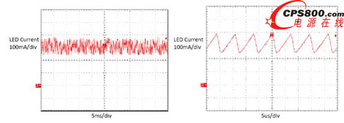 在根據圖1的電路圖配置的電路中,Vin=12 Vac 50Hz。由于AC線路輸入,LED電流出現了很輕微的低頻(AC頻率的兩倍,2 × 50HZ)波動。使用較大容量的C1或較高的Vin將進一步平穩與AC相關的紋波電流。