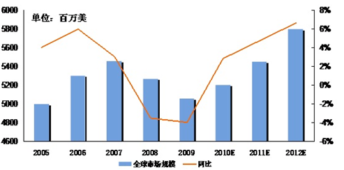 圖2 2005-2012年全球鋁電解電容器銷售額及同比增速(百萬美元)