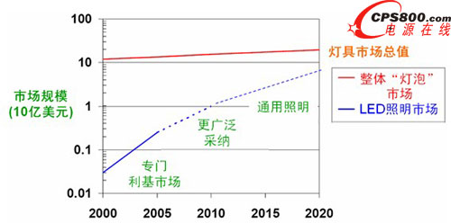 高亮度LED的光輸出、能效及成本正在迅速改善,使其應用范圍不斷擴大。根據LED的工作電壓可以劃分為三個功率等級:0.9V至7V(手機和移動設備)、7V至60V(汽車和LCD背光)和60V至700V(通用照明)。這當中市場成長潛力最大的是汽車、LCD背光和通用照明。汽車應用主要包括氖燈替代、應急車輛燈、組合尾燈、儀表盤照明、信息娛樂、內部照明、中央高位剎車燈、前照燈、停車燈等;LCD背光主要包括大屏幕液晶電視、中等屏幕的筆記本、GPS、相框、上網本等;通用照明主要有離線LED驅動器/鎮流器、街道/區域照明、替代燈泡、替代熒光燈、交通信號燈、工作照明、景觀照明、建筑物照明等。不難看出,今后LED照明將逐步進入到更多的應用領域。
