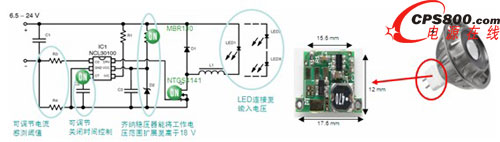 還有一款MR16 LED方案是用于降壓型應用的NCL30100,它是能效大于95%的LED驅動器控制器,開關頻率高達700kHz,不需要輸出電容,Vcc工作范圍從6.35至18 V,可以驅動一個或多個大功率LED,主要用在MR16 LED照明、環境燈照明、太陽能LED、交通照明、室外照明和LED光條等應用。其PCB非常小巧,可以裝入MR16燈的燈座內。NCL30160的遲滯控制特性可在負載瞬期間提供快速的回應,無需小型信號控制環路補償元件。保護特性包括可利用電阻設定LED電流、LED短路保護、欠壓鎖定及熱關閉。