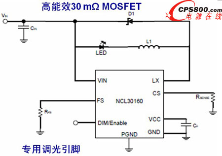 NCL30160是安森美半導體為驅動大功率LED新推出的一款NFET遲滯降壓、恒流驅動器。它是新一代高能效的解決方案,電流提升到了1.5安培,損耗非常低,體積也更小,可最大限度地減少空間和成本。它通過利用僅55mΩ的低導通阻抗內部MOSFET及以100%占空比工作的能力,能夠提供能效高達98%的方案。最高1.4MHz的高開關頻率使設計人員可采用更小的外部元件,將電路板尺寸減至最小及成本降至最低。