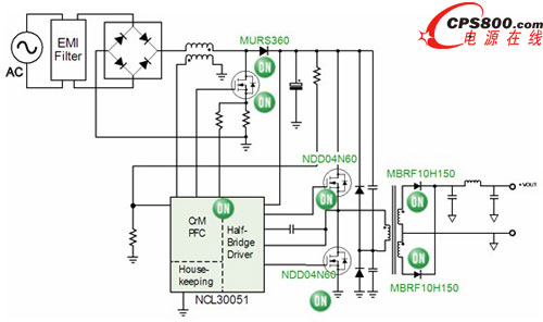 另一款專用LED電源集成電路是NCL30051,能夠為降壓直流-直流(DC-DC)轉換器/LED驅動器提供恒定電壓。該器件集成了一個臨界導電模式(CrM) PFC控制器及一個半橋諧振控制器,并內置600V驅動器,針對離線電源應用進行了優化,具備了所有實現高能效、小外形因數設計所需的特性。