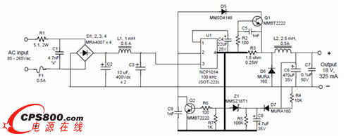 NCP1015單片開關電源IC能滿足交流85-265 Vac寬電壓輸入范圍,適合輸出功率在10 W以內低功率離線降壓LED照明設計。這器件提供豐富特性,如軟啟動、頻率抖動、短路保護、跳周期、最大峰值電流設定及動態自供電(DSS)等,不僅提升能效,還增強可靠性。在C8和IC的第1腳間加一個電阻可以提高能效,適合小電流、高電壓輸出。