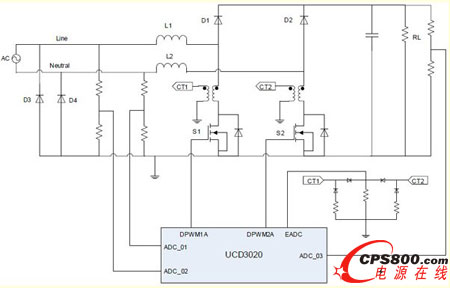 在其他無橋PFC拓撲結構中,圖1是一個已被業界廣泛采用的無橋PFC實例。它具有兩個DC/DC升壓電路,一個由L1、D1和S1組成,另一個則由L2、D2和S2組成。D3和D4為慢恢復二極管。通過參考內部電源地,分別檢測線路(Line)和中性點(Neutral)電壓,測量得到輸入AC電壓。通過對比檢測到的線路和中性點信號,固件便可知道它是一個正半周,還是一個負半周。在一個正半周內,第一個DC/DC升壓電路(L1-S1-D1)有效,并且升壓電流通過二極管D4回到AC中性點;在一個負半周內,第二個DC/DC升壓電路(L2-S2-D2)有效,并且升壓電流二極管通過D3回到AC線。像UCD3020這樣的數字控制器用于控制這種無橋PFC。