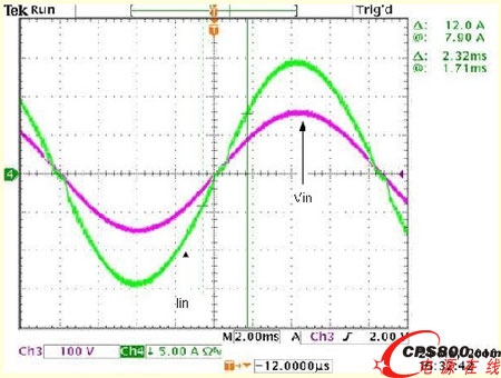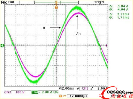 圖5 低壓線路的VIN和IIN波形(VIN=110V,負載=1100W,THD=2.23%,PF=0.998)
