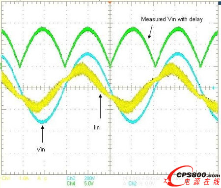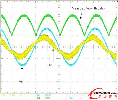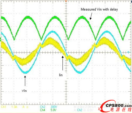 首先,輸入AC電壓通過ADC測量。固件讀取測量到的電壓信號,再加上一些延遲,然后使用延遲后的信號來生成電流參考。圖7、8顯示了1100W無橋PFC的測試結果。在該測試中,VIN=220V,VOUT=360V,而負載=108W(約滿載的10%)。通道1為IIN,通道2為VIN,通道4為帶延遲的測量到的VIN信號。圖7中,測量到的VIN沒有增加延遲,PF=0.86,THD=8.8%.而在圖8中,測量到的VIN信號被延遲了300us,這種情況下,PF被改善到0.90.此外,還可以進一步改善PF,但這將以犧牲THD為代價,因為進一步延遲電流參考,將在AC電壓交叉點處產生更多的電流失真。在圖9中,測量到的VIN被延遲了500us,此時,PF被改善到0.92.但是,電流在電壓交叉點處出現了失真。結果,THD變得更糟糕,達到11.3%。