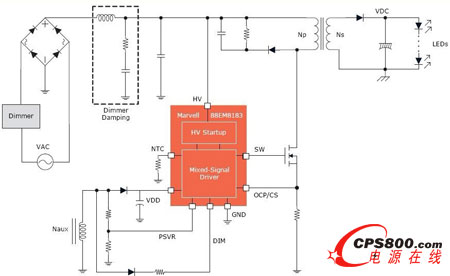 Marvell針對LED照明市場最新推出的高度集成的88EM8183 LED驅動器IC采用了Marvell獨特的混合信號架構和先進的調光控制技術,提供高品質光輸出且調光性能可與白熾燈媲美。可平滑地實現低至1% LED電流的深度調光,相比之下,同類LED驅動器解決方案一般僅能實現10%至20%的調光。以這種幅度調光,人眼感覺不到光強有很大的變化,因此88EM8183顯著提高了性能。
