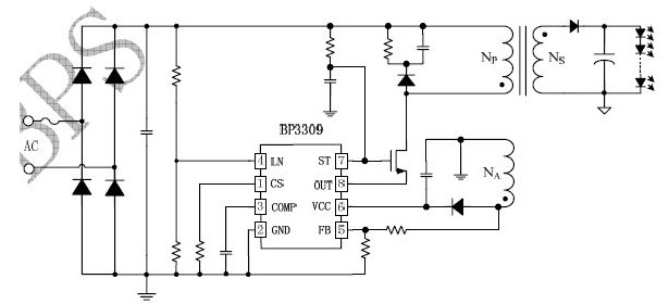 BP3309單級APFC+PSR+CC芯片,啟動時間小于300ms,PFC>0.95,THD<20%,效率>85%,大批量生產(chǎn)恒流精度< +/- 3%,AC全電壓輸入,線性負載調(diào)整率<3%,應(yīng)用電路簡單,性能高度集成,自帶短路保護,開路保護,過熱保護等。單級APFC+CC可能為成為室內(nèi)照明燈具電源首選芯片。HVLED的誕生將引領(lǐng)LED照明技術(shù)又一新潮,BP2812、BP2802高壓PWM恒流驅(qū)動芯片和BP5108、BP5118高壓線性恒流驅(qū)動芯片將為HVLED提供可靠的驅(qū)動電源應(yīng)用方案。
