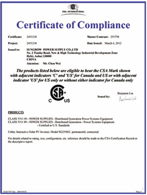 日前,陽(yáng)光電源面向北美市場(chǎng)研制的SG250KC光伏逆變器順利通過(guò)北美的CSA認(rèn)證,獲得了美國(guó)及加拿大市場(chǎng)的“雙國(guó)通行證”。這也是國(guó)內(nèi)第一個(gè)通過(guò)該認(rèn)證的大功率光伏逆變器產(chǎn)品。