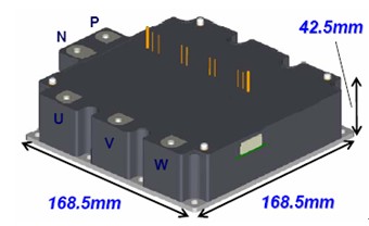 J系列EV-IPM采用第5代LPT-CSTBTTM硅片技術,模塊內硅片上集成電流和溫度傳感器,雜散電感低。目前該產品的電流電壓等級有:300A/600V、600A/600V、150A/1200V和300A/1200V。
