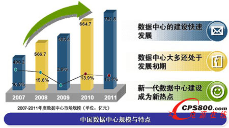 在中國(guó)整體宏觀經(jīng)濟(jì)高速發(fā)展的背景下,中國(guó)的數(shù)據(jù)中心市場(chǎng)一直保持著高速發(fā)展的趨勢(shì),盡管在2009年受到全球金融危機(jī)的影響,數(shù)據(jù)中心市場(chǎng)的增長(zhǎng)率出現(xiàn)了一定比例的下滑,但隨著中國(guó)相關(guān)經(jīng)濟(jì)刺激計(jì)劃的實(shí)施,整體宏觀經(jīng)濟(jì)實(shí)現(xiàn)了“V”型反轉(zhuǎn),數(shù)據(jù)中心市場(chǎng)也出現(xiàn)了快速回升的態(tài)勢(shì),2010年重新回到兩位數(shù)的增長(zhǎng)率上。據(jù)ICTresearch研究,2011年數(shù)據(jù)中心市場(chǎng)規(guī)模為751.8億元,比2010年增長(zhǎng)13.1%。