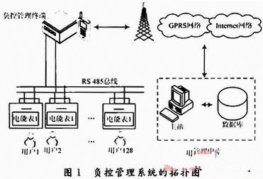 用戶電能表與負控管理終端通過RS 485總線通信,負控管理終端通過RS 485總線讀取用戶電能表數據,將數據交給相應的模塊封裝成IP包發送給GPRS網絡,GPRS網絡和Internet網絡實現無縫連接,主站通過Internet接收到終端通過RS 485接口采集回來的電能表數據,然后顯示、分析、存儲這些電能表數據,然后根據分析結果向負控管理終端下發送遠程控制命令(硬件復位、設置各種通信參數、斷線檢測、超載報警等功能)。以此實現遠程監控負控管理終端,并通過負控管理終端監控電能表。