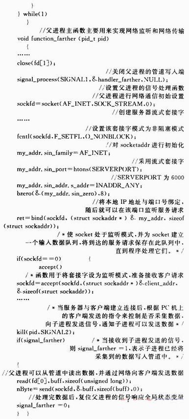 進入主函數,創建管道和子進程,分別啟動父進程和子進程,開始數據采集和網絡傳輸,function_farther()函數和function_child()函數分別為父進程和子進程的主函數。