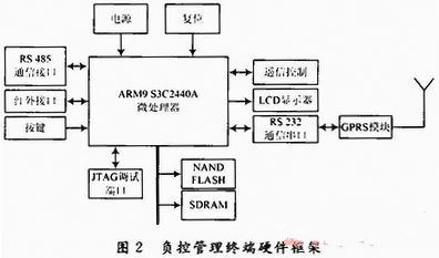 負控管理終端的硬件主要由通信電路、存儲電路和人機交互電路組成。通信電路包括RS 485接口電路、GPRS通信電路、遙信控制電路、紅外接口;存儲電路包括SDRAM和NAND FLASH存儲模塊;人機交互電路包括LCD顯示模塊、按鍵管理、電源和復位電路。其總體的硬件框架如圖2所示。
