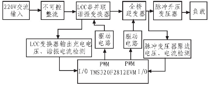 高壓脈沖電源常用的主電路拓撲可以歸納為兩類:電容充放電式和高壓直流開關電源加脈沖生成的兩級式兩種。電容充放電式是通過長時間充電、瞬間放電,即通過控制充放電的時間比例,達到能量壓縮、輸出高壓大功率脈沖的目的。優點是可以輸出的脈沖功率和電壓等級較高,脈沖上升沿較陡;但是,輸出脈沖的精度難以控制,而且重復頻率低,因而應用范圍比較有限,主要應用在核電磁物理研究、煙氣除塵、污水處理、液體殺菌等場合。兩級式結構為高壓直流開關電源級加上脈沖形成級的結構。文中采用這種兩級式拓撲結構,電源系統結構框圖如圖1所示。兩級式有脈沖穩定、可控性好、精度高、重復頻率變化范圍大等特點,因而適用范圍較廣,通用性較好。